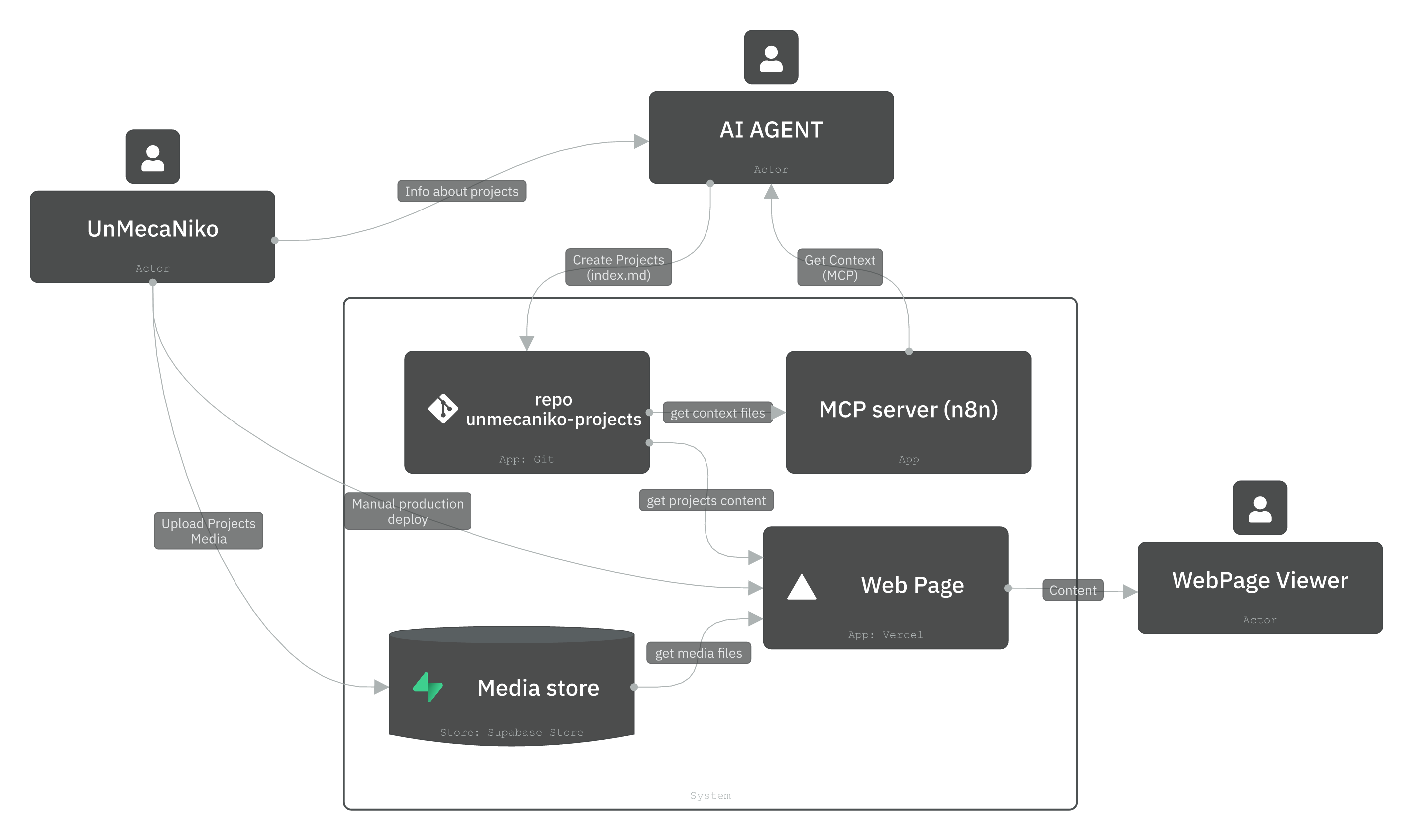 This project presents an automated portfolio management system that combines AI-powered documentation with structured knowledge repositories. The system enables automatic creation and maintenance of project entries on a personal website through the use of MCP (Model Context Protocol) servers, AI agents, and standardized markdown templates.