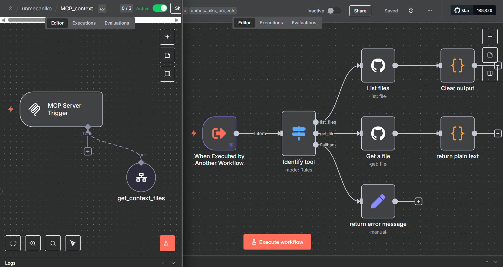 MCP Server Implementation: The MCP server is an n8n trigger that connects as a tool to a sub-workflow that queries information directly from GitHub. This enables AI agents to access repository context and create new project entries automatically.